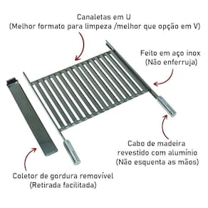 Possui sistema de canaletas que ajudam a escoar a gordura das carnes até o reservatório evitando o excesso de fumaça e a formação de labaredas.