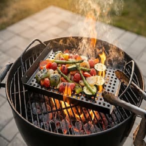 EVITA QUE OS ALIMENTOS CAIAM NA GRELHA: Seu formato funcional ajuda a manter os ingredientes firmes durante o preparo, evitando que pedaços menores passem entre as grades da churrasqueira e garantindo um cozimento mais uniforme.