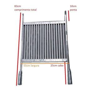 Excelente grelha para fazer seu assado, com acabamento nas canaletas, tem a superfície plana para fazer legumes, linguiças, hambúrguer, bifes, pão-de-alho e tudo mais que quiser grelhar , além de ser melhor para fazer a limpeza por ter acabamento reto, facilitando passar uma esponja e remover a sujeira, sem detalhes redondos como as grelhas comuns .Serve em churrasqueiras profundas pois tem pontas e cabos alongados1 Grelha em Inox tipo Uruguaia com cabos de alumínio.Medida area util: até 55cm largura X 48cm prof. Area util - comprimento total 83cm contando com cabos, vide fotoLargura com pegadores 59cmCabos alongados: 25cmPonta: 10cmEspecificações : Descrição do Produto :Material paletas e estrutura: Inox 430 Paletas: fita de chapa curvada em formato U, soldada com a cavidade para baixo, superfície do grill plano não é barra chata Altura: 1,8 cm, serve para churrasqueiras de trilho, verificar a altura do seu trilho antes de comprar.Observações: a grelha pode ter variação na largura de até 1cm maior e marcas de solda amareladas e ranhuras que fazem parte da fabricação não é defeito, não aceitamos devolução por este motivo . Verifique o espaço do vão de sua churrasqueira antes de comprarFicha técnica- Cor: Inox