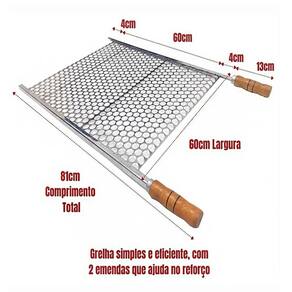 Grelha Moeda 60x60cm de Aço Inox Econômica com Ponteira DESCRIÇÃO: A Grelha Moeda Premium foi desenvolvida para quem busca máxima durabilidade e qualidade no churrasco. Com uma espessura robusta de 1,5mm na tela, essa grelha é sinônimo de resistência, proporcionando uma experiência superior para seus assados. Especificações: Largura da Grelha: 60cm Comprimento Total: 82cm incluindo cabo e ponteira Área Útil: 60cm x 60cm perfeita para diversos tipos de cortes Cabo: 13cm Ponteira: 4cm, ideal para encaixar firmemente em churrasqueiras de alvenaria ou portáteis. Características Premium: - Espessura da Tela: 1,5mm garantindo maior rigidez e longa vida útil. - Material: 100% Inox 430, oferecendo resistência à corrosão e alta durabilidade. Ideal para churrasqueiras com furos de apoio ou suportes de vidro. - Multifuncionalidade: Excelente para assar bifes, linguiças, aves, costelas, pães e vegetais, além de servir como descanso para os alimentos já preparados. - Cabos Térmicos: Feitos de madeira com revestimento de alumínio, impedem o aquecimento, garantindo segurança e conforto ao manusear. Benefícios: - Durabilidade Superior: A grelha não enferruja como outros metais, proporcionando maior vida útil. - Versatilidade: Pode ser Utilizado em qualquer tipo de churrasqueira, seja de alvenaria, portátil ou com suportes, adaptando-se perfeitamente às suas necessidades. - Acabamento Premium: O inox 430 garante não só resistência, mas também um visual moderno e sofisticado Atenção: Verifique as dimensões da sua churrasqueira antes da compra. Marca: Não Informado