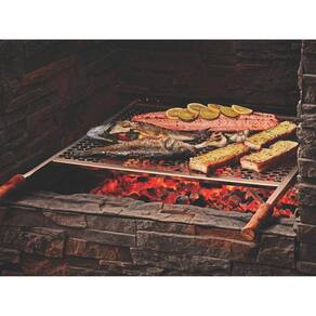 Grelha Tramontina em Aço Inox com Cabo de Madeira 83,5 x 45 cm Churrasqueiro bom é aquele que atende a todos os gostos. Carnes e legumes grelhados são unanimes: todo mundo gosta! Por isso, você precisa ter em casa a Grelha Tramontina em Aço Inox com Cabo de Madeira 83,5x45 cm. Com estrutura em aço inox, é resistente e durável, pois não descasca ou enferruja, além de ser muito fácil de limpar. Possui um cabo de maneira, altamente confortável e que facilita muito o manuseio! Informações Gerais Ideal para grelhar frangos, peixes e legumes. Grelha com estrutura em aço inox. Cabos de madeira natural.