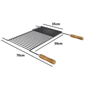 Garantia: 90 dias / Peso: 3,200kg / Cor predominante: preto esmaltado / Ref: 7896621000122; Dimensões: 70cm (C) x 58cm (L) x 2cm (A); Materiais: aço esmaltado e madeira; Conteúdo: 1 grelha para churrasco. Cuidados: antes do primeiro uso, lavar com água e sabão.