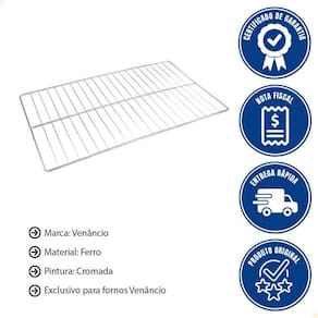 O peso é de 1,3 kg e o produto possui 6 meses de garantia. Tipos de eletrodomésticos compatíveis: Forno 58x79cm | Marcas compatíveis: Venâncio | Modelos compatíveis: Firi90, Firiv90, Feri90 e GRF90 | Material: Ferro | Peso Líquido: 0.0000 | ProdutoAltura-cm: 0 | Altura Produto: 0 | Largura Produto: 0 | EmbalagemComprimento-cm: 84 | Marca: Venâncio | Dias Fornecedor: 1 | Cubagem: 0.026880 | ProdutoLargura-cm: 0 | Modelo: Vidro | EmbalagemAltura-cm: 5 | EmbalagemLargura-cm: 64