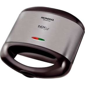 Grill e Sanduicheira Premium Mondial 800W, ideal para preparar diversos tipos de alimentos de forma rápida e prática.Funciona como grill