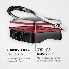 Características: Potência: 1800W 2 em 1: funciona como grill e sanduicheira Revestimento Red Ceramic antiaderente: os alimentos não grudam e deslizam facilmente Chapas onduladas com aquecimento duplo: grelha por igual os dois lados dos alimentos Abertura de 180°: prepara o dobro de alimentos de uma só vez Alimentação mais saudável: dispensa o uso de óleo Grelhas ajustáveis: adapta-se a diferentes espessuras de alimentos Fácil de limpar Estrutura resistente em PP e acabamento em inox