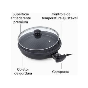 Além disso, possui um termostato com controle de temperatura ajustável, que se conecta através de uma tomada de 3 pinos, permitindo adaptar o nível de calor ao tipo de alimento que está sendo preparado ===================================== Contém: 01 Grill Elétrico