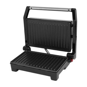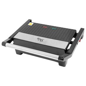 Grill elétrico com chapas antiaderentes, 750W de potência, abertura 180°, base antiderrapante e luz indicadora de funcionamento.Termostato regulável
