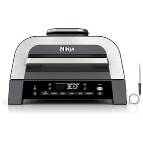 O que está Incluído: Ninja Smart XL Grill, Grade de Grelha, Cesta de 4 litros, Panela de Cozimento de 4 litros, Termômetro Foodi Smart, Escova de Limpeza e Livro de Receitas com 15 Receitas Criadas por Chefs.