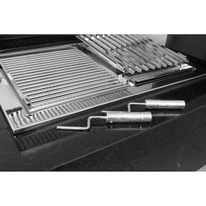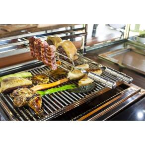 De fácil instalação (encaixe e use), conta com grelhas com manípulos removíveis, e seu sistema de elevação manual permite ajustar a altura do alimento em relação ao fogo.