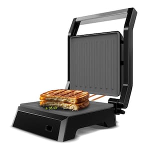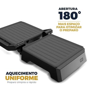 Grill e sanduicheira Britânia com placas onduladas antiaderentes, 520W, abertura de 180 graus, ideal para grelhar hambúrgueres, carnes e sanduíches.Termostato regulável