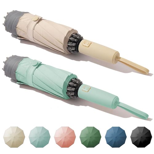 Pacote com 2 guarda-chuvas de viagem automáticos à prova de vento Damp away, guarda-chuva invertido grande e compacto para viagens, guarda-chuva portátil dobrável para carro, estrutura forte de fibra de vidro e alumínio, 10 nervuras duráveis (cáqui e ciano)