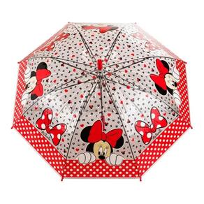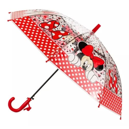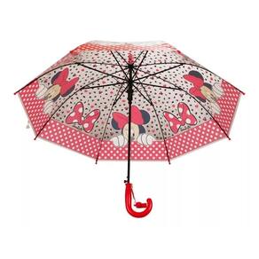 Guarda chuva transparente de borda vermelha com haste vermelho. Estampas na imagem da Minnie gravado com letrinhas. Uso infantil. Vem com apito. Tamanho aberto 76 cm de diâmetro por 66 cm de altura. Material: POE e metal
