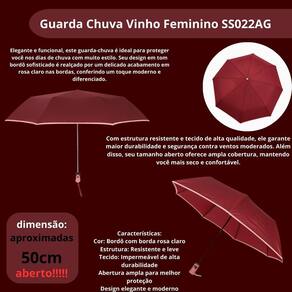 Guarda Chuva Vinho Feminino SS022AG O Guarda-Chuva Feminino SS022AG é a combinação perfeita de elegância e praticidade. Com design moderno na cor vinho, ele oferece proteção contra a chuva com estilo e segurança, sendo compacto e fácil de carregar no dia a dia. Características do produto: Cor vinho sofisticada e versátil Estrutura leve, compacta e resistente Fácil de abrir, fechar e transportar Produzido em material durável de alta qualidade Ideal para levar na bolsa ou mochila Indicado para: Uso diário, passeios, viagens, trabalho e proteção contra chuva. Conteúdo da embalagem: 1 guarda-chuva feminino vinho - modelo SS022AG Marca: Não Informado Ean: 7898181039734