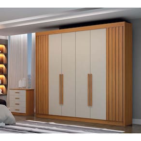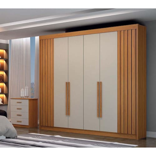 Roupeiro amplo, detalhe em ripado nas portas, 06 gavetas na parte interna, prateleiras para melhor organização.