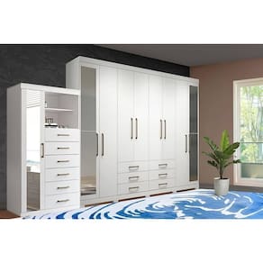 Dimensões(Cm): Comprimento(Profundidade): 46,3cm x Largura: 238,8cm x Altura: 222,6cm Material de Estrutura - Estrutura 100% MDP Tipo de Pintura - Ultravioleta - Texturizada Tipo de Acabamento da Pintura - Semi Brilho Diferenciais Guarda Roupas - Maleiro - Divisão Ele/Ela Material dos Cabideiros - Cabideira Metálico Quantidade de Portas - 8 Portas de Abrir Tipo de Corrediça - c/ Corrediças Metálicas Quantidade de Gavetas - 6 Gavetas Tipo dos Pés - ABS/PVC Quantidade de Prateleiras - 10 Montagem do Produto - Desmontável Garantia - 3 meses