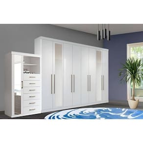 Dimensões(Cm): Comnto(Profundidade): 46,3cm x Largura: 238,8cm x Altura: 217,6cm Material de Estrutura - MDF/MDP Tipo de Pintura - Ultravioleta - Texturizada Tipo de Acabamento da Pintura - Semi Brilho Diferenciais Guarda Roupas - Maleiro - Divisão Ele/Ela Material dos Cabideiros - Cabideira Metálico Quantidade de Portas - 8 Portas de Abrir Tipo de Corrediça - c/ Corrediças Metálicas Quantidade de Gavetas - 4 Gavetas Quantidade de Prateleiras - 8 Montagem do Produto - Desmontável Garantia - 3 meses