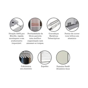 O Guarda Roupa Modulado Prime foi desenvolvido se adequando a vários espaços, de grandes a pequenos. Possui 236 cm de altura oferece divisórias para atender diversas necessidades, profundidade de 56cm possibilitando acomodar roupas sem amassar. Produzido em MDP de 15mm, duas portas de correr com trilhos em alumínio, corrediças telescópicas, a montagem é inteira por minifix que proporciona um acabamento impecável e fundos embutidos com perfil usinado para melhor acabamento e maior resistência.