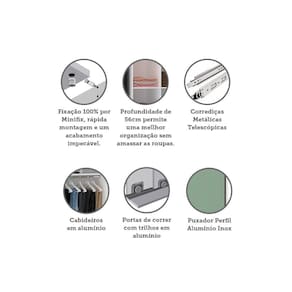 O Guarda Roupa Modulado Prime foi desenvolvido se adequando a vários espaços, de grandes a pequenos. Possui 236 cm de altura oferece divisórias para atender diversas necessidades, profundidade de 56cm possibilitando acomodar roupas sem amassar. Produzido em MDP de 15mm, duas portas de correr com trilhos em alumínio, corrediças telescópicas, a montagem é inteira por minifix que proporciona um acabamento impecável e fundos embutidos com perfil usinado para melhor acabamento e maior resistência.