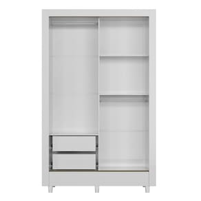 Possui 2 amplas gavetas com corrediças metálicas. Cabideiros em alumínio e prateleiras. Para a abertura das suas portas, conta com puxadores em ABS, com design moderno e bonito. O acabamento é em verniz brilhante, tudo feito dentro dos padrões de preservação do meio ambiente, com