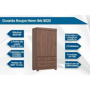 Material dos Cabideiros - Cabideiro de Madeira Quantidade de Portas - 2 Portas de Correr Tipo de Corrediça - c/ Corrediças Metálicas Quantidade de Gavetas - 4 Gavetas Tipo dos Pés - ABS/PVC - Pés Opcionais Quantidade de Prateleiras - 2
