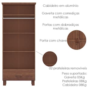 Peso Suportado: 08Kg prateleira, 05Kg gaveta, 08Kg cabideiro