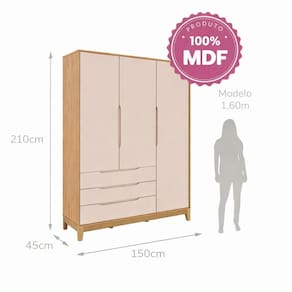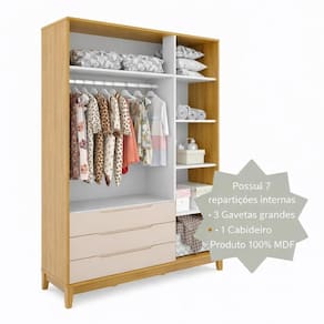 Produzido em 100% MDF, com pés em madeira maciça, oferece durabilidade e segurança no uso diário. Seu interior amplo com 7 repartições permite organizar roupas e acessórios de forma prática, mantendo tudo sempre em ordem.