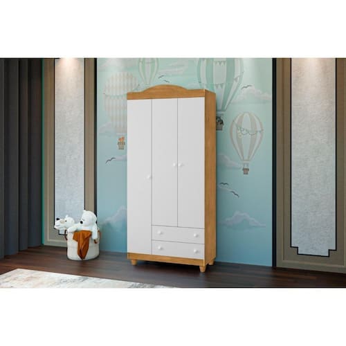 Guarda-Roupa 3 Portas 2 Gavetas Lara Nature/Branco. O Guarda Roupa Infantil 3 Portas Lara, conta com três portas clássicas, que dão acesso ao espaço interno, onde você pode guardar a bolsa maternidade e toalhas de banho. Inclusive, as gavetinhas com puxadores do Guarda-Roupa serão ótimas para guardar itens do enxoval de bebê, como fraldinhas, bodies e até mesmo o álbum de fotografia do neném! Ean: 7899825813819