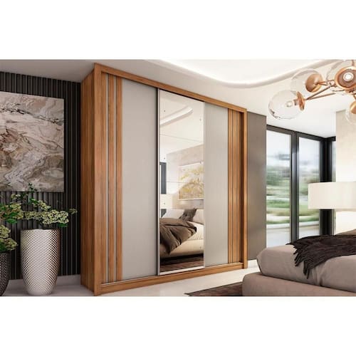 Material do Calceiro - Calceiro Metálico Tipo de Cabideiro - Aéreo Material dos Cabideiros - Cabideira Metálico Tipo de Porta do Guarda-Roupa - Portas de Correr Material das Portas - Portas em MDP Material do trilho da porta de correr - Trilho Metálico - Trilho Superior em PVC Diferenciais das Portas - Portas Ripadas Quantidade de Portas - 3 Portas de Correr Quantidade de Portas com Espelho - 1 Porta com Espelho Tipo de Espelho - Espelho Externo Quantidade de Espelhos - 4 Espelhos Material das Gavetas - Gavetas em MDP Tipo de Corrediça - c/ Corrediças Metálicas Quantidade de Gavetas - 2 Gavetas Tipo dos Pés - ABS/PVC Quantidade de Pés - 8 pés Material das Prateleiras - Prateleiras em MDP Quantidade de Prateleiras - 4 Quantidade de Nichos - 5 Nichos