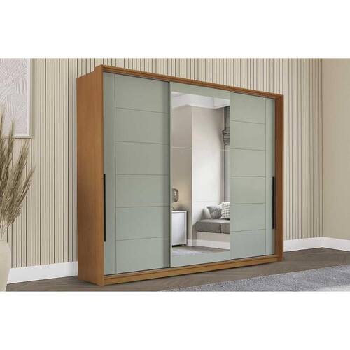 Guarda Roupa Casal 3 Portas de Correr (1 c/ espelho) e 4 Gavetas Lisboa Freijo/Verde - Politorno
