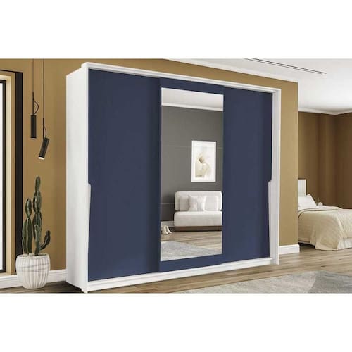 Guarda Roupa Casal 3 Portas de Correr (1 c/ espelho) e 4 Gavetas Porto Branco/Azul - Politorno