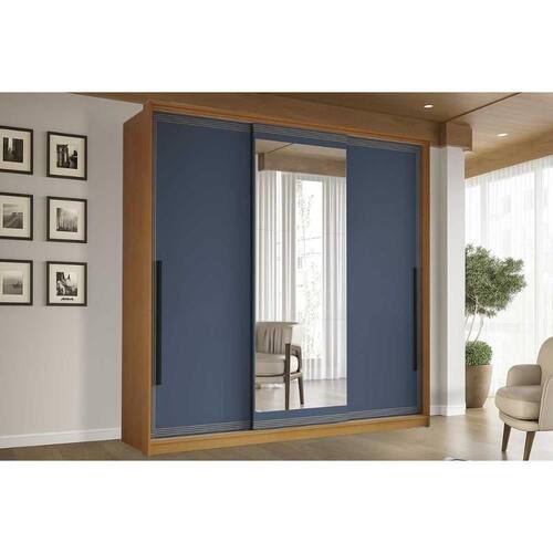 Guarda Roupa 3 Portas De Correr (1 C/ Espelho) E 4 Gavetas Valência Freijo/azul - Politorno