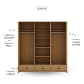Porque quando o quarto transmite paz, o descanso vem fácil, e a rotina agradece. Acabamento da Prateleira: Pintura UV Escala de Brilho da Prateleira: Fosco Possui Cabideiros: Sim Acabamento da Gaveta: Pintura UV Material do Puxador da Gaveta: Metal Possui Organizador de Gaveta: Não Acabamento da Porta: Pintura UV Escala de Brilho da Porta: Fosco Material do Puxador da Porta: Metal Altura dos Pés: 5,5 cm Altura Máxima dos Pés: 5.5000 Ambiente Principal: Quarto codigo_ean: 7900288338181 Complexidade da Montagem: Média: pode ser montado por mais de uma pessoa e/ou necessite de maior conhecimento para montagem Cor: Freijó Cor do Produto: Freijó Escala de Brilho: Fosco Espessura da Estrutura (mm): 16 mm Espessura das Portas (mm): 16 mm Espessura das Prateleiras (mm): 16 mm Espessura do Fundo (mm): 2,8 mm Espessura do Fundo das Gavetas (mm): 2,8 mm Guarda-Roupa Suporta Até (kg): 121 kg Itens Inclusos: 1 Guarda-Roupa, KIt Ferragens e Manual de Montagem Linha ou Coleção: Topázio Manual de Especificação Técnica: https://product-hub-prd.madeiramadeira.com.br/282522331/documents/dfe8c508-f5a9-46df-8829-e1ea40e138063403982479517716088764912.pdf Manual de Montagem e Instalação: https://product-hub-prd.madeiramadeira.com.br/282522331/documents/d93697b5-c7c2-4c02-8677-b823ead569023403981479517716088543803.pdf Marca: Finestra Material da Gaveta: Madeira Maciça Material da Porta: Madeira Maciça Material da Prateleira: Madeira Maciça Material dos Pés: Madeira Maciça Material Principal: Madeira Maciça modular: Não Necessita Montagem: Sim Origem do Produto: Nacional Peso: 105,3 kg Peso Máximo por Gaveta: 5 kg Peso Máximo por Prateleira: 5 kg Possui Calceiros: Não Possui Espelho: Não Possui Pés: 06 Possui Portas: Sim Possui Prateleiras: Sim Produto Montado: Sim Quantidade de Gavetas: 03 Gavetas Quantidade de Prateleiras: 06 Prateleiras Recomendações de Uso, Manutenção e Limpeza: Seguir a ordem do manual de montagem; Evitar batidas e contato com objetos cortantes; Não deixe o móvel em locais muito úmidos; Limpar com pano levemente umedecido com água, seguido de pano seco; Não utilizar produtos químicos ou abrasivos; Evite incidência direta de luz solar; Algumas pinturas novas, embora atóxicas, podem apresentar odores. Para amenizá-los, matenha o móvel em local arejado nos primeiros dias de uso. Sistema de Montagem: parafusos Tipo de Corrediça da Gaveta: Metálica Telescópica Tipo de Dobradiça/Corrediça da Porta: Alumínio Tipo de Gaveta: Externa Tipo de Guarda-Roupa: Casal Tipo de Madeira Maciça: Pinus Tipo de Madeira Maciça da Gaveta: Pinus Tipo de Madeira Maciça da Porta: Pinus Tipo de Madeira Maciça da Prateleira: Pinus Tipo de Madeira Maciça dos Pés: Pinus Tipo de Puxador da Gaveta: Externo Tipo de Puxador da Porta: Embutido