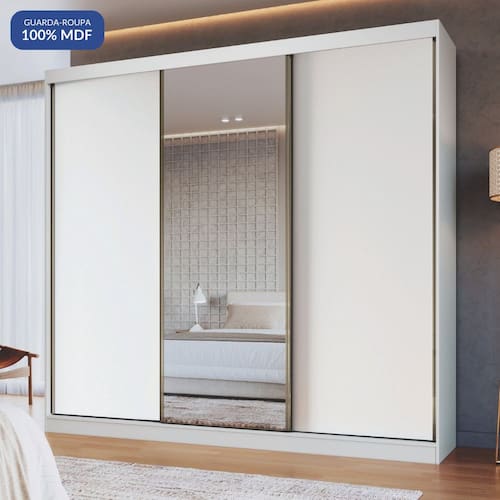 O Guarda-Roupa Imperial New se destaca pelo design moderno e pela resistência do 100% MDF. Possui perfil puxador em alumínio e portas deslizantes com amortecedor anti-impacto, que garantem fechamento suave e silencioso. As gavetas têm corrediças telescópicas de extração total, oferecendo abertura completa e acesso facilitado, para mais praticidade no dia a dia. O interior é bem dividido, proporcionando organização funcional e otimizada para a rotina. Acabamento da Prateleira: Pintura UV Escala de Brilho da Prateleira: Semi-Fosco Possui Cabideiros: Sim Acabamento da Gaveta: Pintura UV Escala de Brilho da Gaveta: Semi-Fosco Possui Organizador de Gaveta: Não Acabamento da Porta: Pintura Texturizada UV Escala de Brilho da Porta: Semi-Fosco Material do Puxador da Porta: Alumínio Altura do Espelho: 213,8 cm Ambiente Principal: Quarto codigo_ean: 7900288265395 Complexidade da Montagem: Média: pode ser montado por mais de uma pessoa e/ou necessite de maior conhecimento para montagem Cor: Branco Line Cor da Porta: Branco Cor do Produto: Branco Line Cor Interna: Branco Line Escala de Brilho: Semi-Fosco Espessura da Estrutura (mm): 15 mm Espessura das Portas (mm): 15 mm Espessura das Prateleiras (mm): 15 mm Espessura do Espelho: 20 mm Espessura do Fundo (mm): 3 mm Espessura do Fundo das Gavetas (mm): 3 mm Formato do Espelho: Retangular Gaveta com Chave: Não Itens Inclusos: 1 Guarda-Roupa, Kit Ferragens e Manual de Montagem Largura do Espelho: 83,4 cm Linha ou Coleção: Imperial New Manual de Montagem e Instalação: https://product-hub-prd.madeiramadeira.com.br/544867796/documents/0c368b59-2a8c-43ad-9af2-b2323df5c19f8edf1af130ffd6b41760560841.pdf Marca: Móveis Castro Material da Gaveta: MDF Material da Porta: MDF/Espelho Material da Prateleira: MDF Material Principal: MDF modular: Não Necessita Montagem: Sim Origem do Produto: Nacional Peso: 200,6 kg Peso Máximo por Gaveta: 5 kg Peso Máximo por Prateleira: 8 kg Porta Janelada: Não Possui Calceiros: Não Possui Espelho: Sim Possui Pés: Não Possui Portas: Sim Possui Prateleiras: Sim Produto Montado: Sim Quantidade de Cabideiros: 02 Cabideiros Quantidade de Espelho: 01 Quantidade de Gavetas: 04 Gavetas Quantidade de Portas com Espelhos: 1 Porta com Espelho Quantidade de Prateleiras: 11 Prateleiras Recomendações de Uso, Manutenção e Limpeza: Limpar com pano levemente umedecido Sistema de Montagem: Parafusos, minifix e cavilhas Tipo de Corrediça da Gaveta: Metálica Telescópica Tipo de Dobradiça/Corrediça da Porta: Alumínio Tipo de Fixação do Espelho: Molduras Tipo de Gaveta: Interna Tipo de Guarda-Roupa: Casal Tipo de Puxador da Gaveta: Não Possui Tipo de Puxador da Porta: Externo
