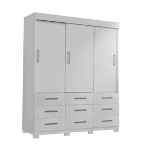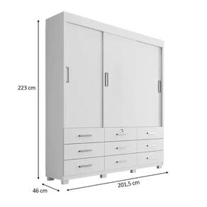 Com 3 portas de correr, você terá acesso fácil a suas roupas. Suas 9 gavetas com corrediças telescópicas garantem um deslizar suave, oferecendo espaço de armazenamento inteligente. Os cabideiros de alumínio são perfeitos para manter suas roupas organizadas. Além de possuir uma gaveta central com chave. Adquira agora mesmo!Diferenciais:- Cor: Branco fosco- 3 Portas deslizantes- 9 Gavetas com corrediças telescópicas- Gaveta central com fechadura- 2 Cabideiros de alumínio- Pés e puxadores PVC- Pintura U.V- Prateleiras internas- Amplo espaço interno- Fabricação MDF e MDP 12mm e 15mmDimensões do produtoAltura: 223 cmLargura: 201 cmProfundidade: 46 cmPeso: 128 KgVolume total: 04Produto entregue desmontadoAcompanha manual e todas ferragens necessárias para montagemGarantia: 3 meses contra defeito de fabricação
