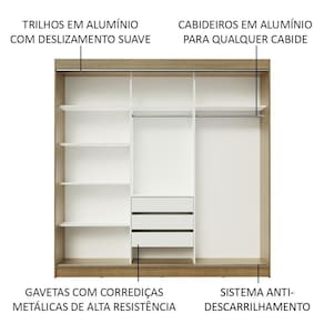 O tamanho é pensado especialmente para a necessidade de um casal. A divisão interna é ótima, com muitas prateleiras e nichos, além de três gavetas espaçosas com corrediças metálicas, muito mais seguras e resistentes.
