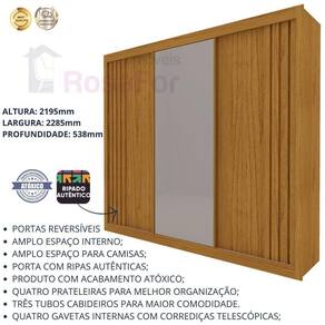 O Roupeiro Santorini tem um design elegante e moderno, perfeito para seu quarto. Com interior espaçoso, este roupeiro conta com quatro gavetas de corrediças telescópicas, quatro prateleiras e três tubos cabideiros para uma boa organização. Possui três portas de correr sendo as duas laterais com ripas autênticas em 100% MDF e a central com espelho inteiriço, unindo funcionalidade e beleza. Portas reversíveis.