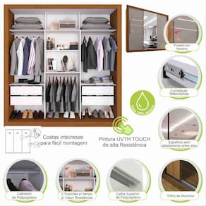Este lindo Guarda-Roupa Panama Espelhado Salleto e fabricado em MDP/MDF, diferenciado pela sua resistencia, durabilidade, funcionalidade e beleza, ele e a melhor opcao para deixar seu dormitorio mais arrumado e convidativo. Com corredicas telescopicas que permitem uma abertura total das gavetas, Portas de correr com trilho em aluminio com trava de seguranca evitando que a porta se solte do trilho, costa inteirica sem perfil H, parte interna clean toda branca, divisoes internas amplas quem oferecem praticidade e organizacao, contando tambem com sapateira embutida. Se encaixa facilmente em varios estilos de decoracao. Aproveite, voce merece.