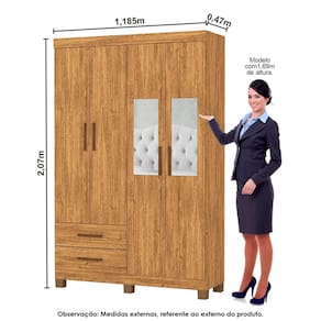 O Guarda-Roupa Genova 4 Portas 2 Gavetas Com Espelho e Pés, é ideal para quem procura um produto compacto e funcional. Possui 2,07m de altura, 1,185m de largura e 0,47m de profundidade combinado com 2 gavetas, 2 prateleiras e um grande cabideiro, deixando o produto com uma ótima divisão interna. O maleiro é ideal para guardar malas, cobertores, edredons. O cabideiro além de resistente, é ideal para pendurar pares de blusas, camisas acessórios. As prateleiras são perfeitas para colocar roupas como blusas, shorts, regatas, kits de maquiagem, toalhas, caixinhas com acessórios e bolsas menores. As gavetas fixadas sobre corrediças metálicas, são ideais para guardas blusas dobradas, shorts, malhas e roupas íntimas. Estrutura do produto em MDP.