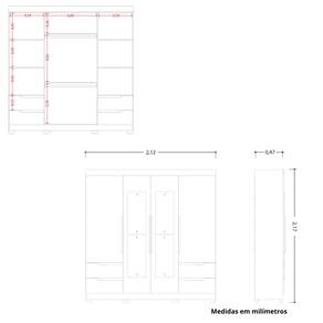 Características: Estrutura em MDP 4 gavetas com frentes usinadas e corrediças telescópicas 4 portas de dobradiças 2 Cabideiros em alumínio Puxadores de MDF revestidos Pés inclusos