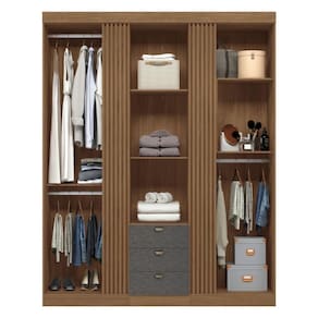 Feito em MDP, além de possui 4 portas, 4 gavetas, 5 prateleiras e 3 cabideiros.