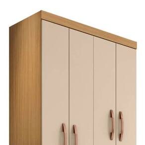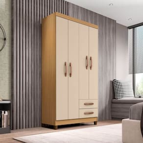 Com 2 gavetas e 4 portas, este guarda-roupas oferece amplo espaço de armazenamento para roupas, acessórios e objetos pessoais. As prateleiras suportam até 5 kg, enquanto as gavetas podem suportar até 3 kg cada. Além disso, ele possui 1 cabideiro em metal e 6 puxadores que complementam seu design moderno.