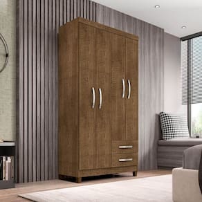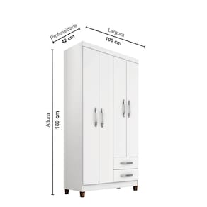 Com 2 gavetas e 4 portas, este guarda-roupas oferece amplo espaço de armazenamento para roupas, acessórios e objetos pessoais. As prateleiras suportam até 5 kg, enquanto as gavetas podem suportar até 3 kg cada. Além disso, ele possui 1 cabideiro em metal e 6 puxadores que complementam seu design moderno.