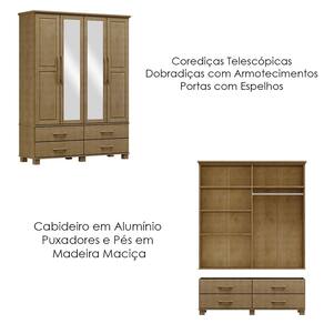 Guarda-roupa Bipartido produzido em madeira maciça de pinus de reflorestamento, garantindo durabilidade e resistência, uma peça sofisticada e funcional, perfeita para manter tudo organizado com estilo. Pintura acetinada com verniz PU e UV, proporcionando beleza e proteção extra, possuindo 04 portas, sendo 02 centrais com espelhos, equipadas com dobradiças com amortecimento, proporcionando fechamento sem impactos, além de 04 gavetas com corrediças telescópicas, permitindo abertura total e deslizamento suave e silencioso. Conta com 04 prateleiras internas e cabideiro em alumínio, ideal para roupas e acessórios, puxadores e pés em madeira maciça, garantindo um toque refinado e elegante. Este móvel chegará em sua casa separado em 04 volumes.