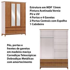 Guarda-roupa 4 Portas e 4 Gavetas com estrutura em MDF de 15mm (portas e gavetas em madeira maciça de pinus de reflorestamento), garantindo durabilidade e resistência, uma peça sofisticada e funcional, perfeita para manter tudo organizado com estilo. Pintura acetinada com verniz PU e UV, proporcionando beleza e proteção extra, possuindo 04 portas, sendo 02 centrais com espelho, equipadas com dobradiças com amortecimento, proporcionando fechamento sem impactos, além de 04 gavetas com corrediças telescópicas, permitindo abertura total e deslizamento suave e silencioso. Conta com 04 prateleiras internas e 01 cabideiro em alumínio, ideal para roupas e acessórios, puxadores cava e pés em madeira maciça, garantindo um toque refinado e elegante. Este móvel chegará em sua casa separado em 04 volumes.