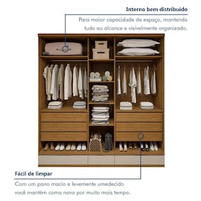 As gavetas ficam na parte interna e externa, organizando melhor os itens. Acabamento da Prateleira: Impressão Escala de Brilho da Prateleira: Fosco Acabamento da Gaveta: Impressão Escala de Brilho da Gaveta: Fosco Possui Organizador de Gaveta: Não Acabamento da Porta: Impressão Escala de Brilho da Porta: Fosco Material do Puxador da Porta: MDF Ambiente Principal: Quarto codigo_ean: 7900288200761 Complexidade da Montagem: Alta: deve ser montado por um montador especializado Cor: Cedro/Off White Cor do Produto: Cedro/Off White Cor do Puxador: Marrom Escala de Brilho: Fosco Espessura da Estrutura (mm): 15 mm Espessura das Portas (mm): 15 mm Espessura das Prateleiras (mm): 15 mm Espessura do Fundo (mm): 3 mm Espessura do Fundo das Gavetas (mm): 3 mm Gaveta com Chave: Não Itens Inclusos: 1 Guarda-Roupa, Manual de Montagem e Kit Ferragens. Linha ou Coleção: Urbano Manual de Montagem e Instalação: https://product-hub-prd.madeiramadeira.com.br/470610500/documents/7c75ae53-f550-4739-8161-51b7b49cc3d711744799955449922839171072.pdf Marca: Josandro Material da Gaveta: MDF Material da Porta: MDF Material da Prateleira: MDF Material Principal: MDF modular: Não Necessita Montagem: Sim Origem do Produto: Nacional Peso: 215 kg Peso Máximo por Gaveta: 5 kg Peso Máximo por Prateleira: 10 kg Porta Janelada: Não Possui Calceiros: Não Possui Espaço para Vestidos Longos: Sim Possui Espelho: Não Possui Espelho Interno: Não Possui Ganchos: Não Possui Pés: Não Possui Portas: Sim Possui Prateleiras: Sim Possui Sapateira: Sim Produto Montado: Sim Quantidade de Cabideiros: 02 Cabideiros Quantidade de Gavetas: 06 Gavetas Quantidade de Prateleiras: 06 Prateleiras Recomendações de Uso, Manutenção e Limpeza: Limpar com flanela limpa e seca. Não usar produtos abrasivos. Sistema de Montagem: Parafusos Tipo de Corrediça da Gaveta: Metálica Telescópica Tipo de Dobradiça/Corrediça da Porta: Telescópica Tipo de Gaveta: Interna Tipo de Guarda-Roupa: Casal Tipo de Puxador da Gaveta: Não Possui Tipo de Puxador da Porta: Embutido