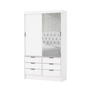 Características do Guarda-Roupa: • 2 portas, com design elegante e funcional.• 6 gavetas, oferecendo organização prática no dia a dia.• 2 prateleiras internas, para melhor aproveitamento do espaço.• 1 porta espelhada, que ampliam o ambiente e valorizam o visual. • Portas com deslizamento suave, garantindo conforto no uso diário. Produzido em MDP •1 Cabideiro espaçoso