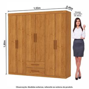 O Guarda-roupa Aurora 6 portas 2 Gavetas , é um produto perfeito para quem possui um ambiente com espaço reduzido e ainda procura qualidade e durabilidade no mesmo móveis. Possui 1,87m de altura, 1,53m de largura e 0,40m de profundidade combinado com 6 portas, 2 gavetas, 2 prateleiras e um grande cabideiro, deixando o produto com uma ótima divisão interna. As prateleiras são perfeitas para colocar roupas como blusas, shorts, regatas, kits de maquiagem, toalhas, caixinhas com acessórios e bolsas menores. As gavetas fixadas sobre corrediças metálicas, são ideais para guardas blusas dobradas, shorts, malhas e roupas íntimas. Estrutura do produto em MDP. Acabamento da Prateleira: Verniz Escala de Brilho da Prateleira: Semi-Fosco Possui Cabideiros: Sim Acabamento da Gaveta: Pintura Escala de Brilho da Gaveta: Semi-Brilho Material do Puxador da Gaveta: PVC Possui Organizador de Gaveta: Não Acabamento da Porta: Pintura UV Escala de Brilho da Porta: Fosco Material do Puxador da Porta: PVC Ambiente Principal: Quarto codigo_ean: 7900288227393 Complexidade da Montagem: Média: pode ser montado por mais de uma pessoa e/ou necessite de maior conhecimento para montagem Cor: Cinamomo/Branco Cor da Porta: Cinamomo Cor do Produto: Cinamomo/Branco Escala de Brilho: Fosco Espessura da Estrutura (mm): 12 mm Espessura das Portas (mm): 12 mm Espessura das Prateleiras (mm): 12 mm Espessura do Fundo (mm): 2,5 mm Espessura do Fundo das Gavetas (mm): 2,5 mm Gaveta com Chave: Não Itens Inclusos: 1 Guarda-Roupas e Kit Ferragem Linha ou Coleção: Aurora Manual de Montagem e Instalação: https://product-hub-prd.madeiramadeira.com.br/931177825/documents/41579bc2-7a2f-4912-858e-dee64598242e319627940417576005880897.pdf Marca: Carioca Móveis Material da Gaveta: MDP Material da Porta: MDP Material da Prateleira: MDP Material Principal: MDP modular: Não Necessita Montagem: Sim Origem do Produto: Nacional Peso: 62,45 kg Peso Máximo por Gaveta: 5 kg Peso Máximo por Prateleira: 5 kg Porta Janelada: Não Possui Calceiros: Não Possui Espelho: Não Possui Pés: Não Possui Portas: Sim Possui Prateleiras: Sim Produto Montado: Sim Quantidade de Cabideiros: 01 Cabideiro Quantidade de Gavetas: 02 Gavetas Quantidade de Prateleiras: 04 Prateleiras Recomendações de Uso, Manutenção e Limpeza: Limpar com flanela ou pano macio seco. Não utilizar produtos abrasivos, desengordurantes, álcool ou solvente. Não expor o produto diretamente à luz solar e à umidade. Sistema de Montagem: Parafusos e Cavilhas Tipo de Corrediça da Gaveta: Metálica Simples Tipo de Dobradiça/Corrediça da Porta: Metálica Tipo de Gaveta: Externa Tipo de Guarda-Roupa: Casal Tipo de Puxador da Gaveta: Externo Tipo de Puxador da Porta: Externo