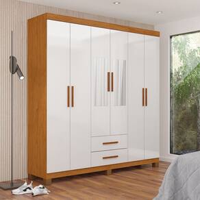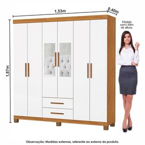 O Guarda-roupa Aurora 6 portas 2 Gavetas Com Espelho e Pés, é um produto perfeito para quem possui um ambiente com espaço reduzido e ainda procura qualidade e durabilidade no mesmo móveis. Possui 1,87m de altura, 1,53m de largura e 0,40m de profundidade combinado com 6 portas, 2 gavetas, 2 prateleiras e um grande cabideiro, deixando o produto com uma ótima divisão interna. As prateleiras são perfeitas para colocar roupas como blusas, shorts, regatas, kits de maquiagem, toalhas, caixinhas com acessórios e bolsas menores. As gavetas fixadas sobre corrediças metálicas, são ideais para guardas blusas dobradas, shorts, malhas e roupas íntimas. Estrutura do produto em MDP. Acabamento da Prateleira: Verniz Escala de Brilho da Prateleira: Semi-Fosco Possui Cabideiros: Sim Acabamento da Gaveta: Pintura Escala de Brilho da Gaveta: Semi-Brilho Material do Puxador da Gaveta: PVC Possui Organizador de Gaveta: Não Acabamento da Porta: Pintura UV Escala de Brilho da Porta: Semi-Brilho Material do Puxador da Porta: PVC Acabamento dos Pés: Pintura Altura do Espelho: 60 cm Altura dos Pés: 7 cm Altura Máxima dos Pés: 7.0000 Ambiente Principal: Quarto codigo_ean: 7900288228178 Complexidade da Montagem: Média: pode ser montado por mais de uma pessoa e/ou necessite de maior conhecimento para montagem Cor: Cinamomo/Branco Cor da Porta: Branco Cor do Produto: Cinamomo/Branco Cor do Puxador: Marrom Cor Interna: Branco Escala de Brilho: Semi-Brilho Espessura da Estrutura (mm): 12 mm Espessura das Portas (mm): 12 mm Espessura das Prateleiras (mm): 12 mm Espessura do Espelho: 3 mm Espessura do Fundo (mm): 2,5 mm Espessura do Fundo das Gavetas (mm): 2,5 mm Fita Integrada: Sim Formato do Espelho: Retangular Gaveta com Chave: Não Itens Inclusos: 1 Guarda-Roupas e Kit Ferragem Largura do Espelho: 20 cm Linha ou Coleção: Aurora Manual de Montagem e Instalação: https://product-hub-prd.madeiramadeira.com.br/554820360/documents/69c8afbc-3006-4208-b205-938c1749046e319715240417576098263465.pdf Marca: Carioca Móveis Material da Gaveta: MDP Material da Porta: MDP Material da Prateleira: MDP Material dos Pés: PVC Material Principal: MDP modular: Não Necessita Montagem: Sim Origem do Produto: Nacional Peso: 64,5 kg Peso Máximo por Gaveta: 5 kg Peso Máximo por Prateleira: 5 kg Porta Janelada: Não Possui Calceiros: Não Possui Espelho: Sim Possui Pés: 06 Possui Portas: Sim Possui Prateleiras: Sim Produto Montado: Sim Quantidade de Cabideiros: 01 Cabideiro Quantidade de Espelho: 02 Espelhos com Tamanhos Iguais Quantidade de Gavetas: 02 Gavetas Quantidade de Portas com Espelhos: 2 Portas com Espelho Quantidade de Prateleiras: 04 Prateleiras Recomendações de Uso, Manutenção e Limpeza: Limpar com flanela ou pano macio seco. Não utilizar produtos abrasivos, desengordurantes, álcool ou solvente. Não expor o produto diretamente à luz solar e à umidade. Sapatas Niveladoras: Não Sistema de Montagem: Parafusos e Cavilhas Tipo de Corrediça da Gaveta: Metálica Simples Tipo de Dobradiça/Corrediça da Porta: Metálica Tipo de Fixação do Espelho: Fita Dupla Face Tipo de Gaveta: Externa Tipo de Guarda-Roupa: Casal Tipo de Puxador da Gaveta: Externo Tipo de Puxador da Porta: Externo