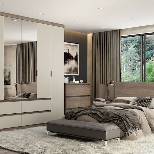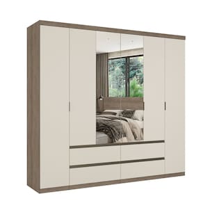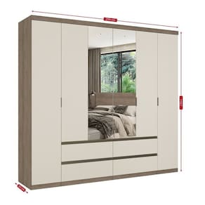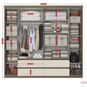 É constituído de 6 portas e 4 gavetas externas com trilho telescópico que conferem conforto e praticidade ao móvel. Seu amplo espaço interno possui cabideiros, maleiros grandes e muitas prateleiras, uma excelente divisão ele/ela.