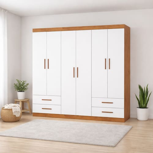 Seu interior conta com excelente distribuição, incluindo 4 gavetas espaçosas, ideais para armazenar roupas dobradas e acessórios. O espaço para cabides permite acomodar diversas peças penduradas, mantendo tudo organizado e bem conservado. Com design moderno e acabamento de qualidade, o Guarda-Roupa  une funcionalidade e beleza em um único móvel.